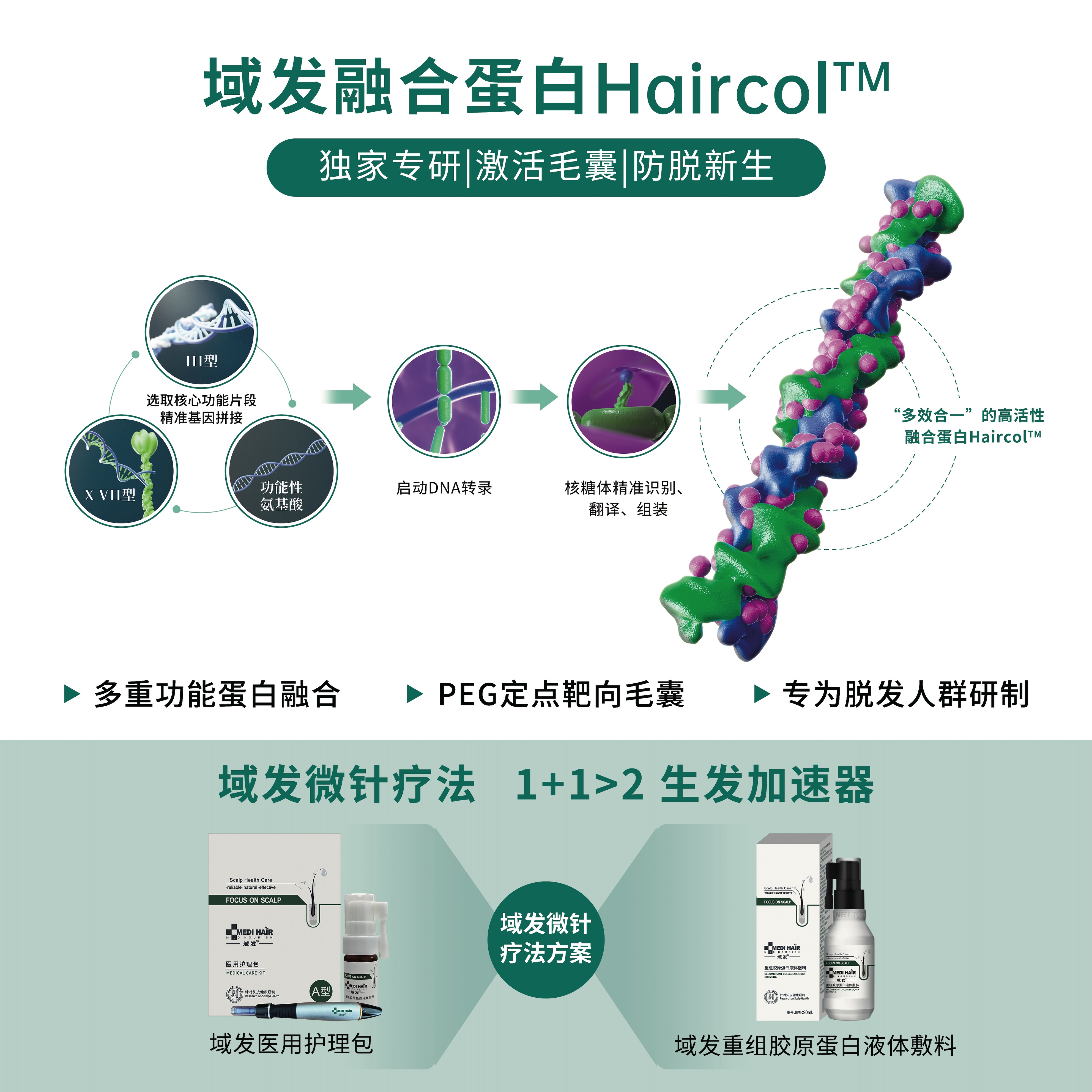 这一创新技术已应用于域发医用护理包和重组胶原蛋白液体敷料等产品中,通过基础研究、细胞实验、动物实验至临床研究的完整科学验证体系,为临床脱发治疗提供了更有效的解决方案。